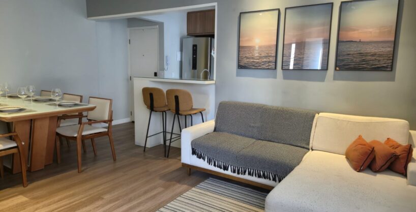 Studio totalmente mobiliado e decorado em andar alto, 1 suíte, sala de jantar, estar, escritório,…